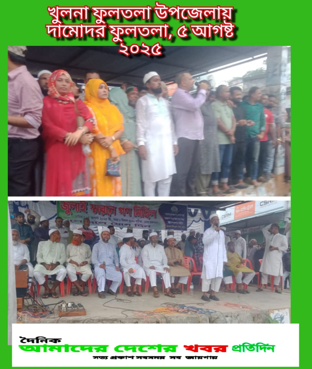 প্রথম বর্ষপূর্তি জুলাই গণঅভ্যুত্থান দিবস পালনের মধ্য দিয়ে, শ্রদ্ধার সাথে স্মরণ করেছেন ৫ আগস্ট শহীদদের বিএনপি ও জামাত, একই স্থানে একই মঞ্চে, আজ বিকাল ৩:৩০ মিনিটে ফুলতলা স্বাধীনতা চত্বরে জামাতের এক বছর পূর্তি উপলক্ষে ৫ আগস্টের নানা দিক নিয়ে, আলোচনা করেন,পরে আসরের নামাজের পর ফুলতলা স্বাধীনতা চত্বরে বিএনপি আনুষ্ঠানিকতা শুরু করেন, ফুলতলা থানার ( ওসি) জিল্লার রহমান দুই দলকে নিরাপত্তার চাদরে ঢেকে সমাবেশ শেষ করেন, ফুলতলার বিভিন্ন ওয়ার্ড থেকে, বিএনপি ও জামাতের বিশাল বিশাল মিছিল নিয়ে নেতা ও কর্মীদের ফুলতলাতে আসতে দেখা গেছে, এবং ফুলতলা স্বাধীনতা চত্বর এক বছর জুলাই গণঅভ্যুত্থান দিবস পালন করছেন।