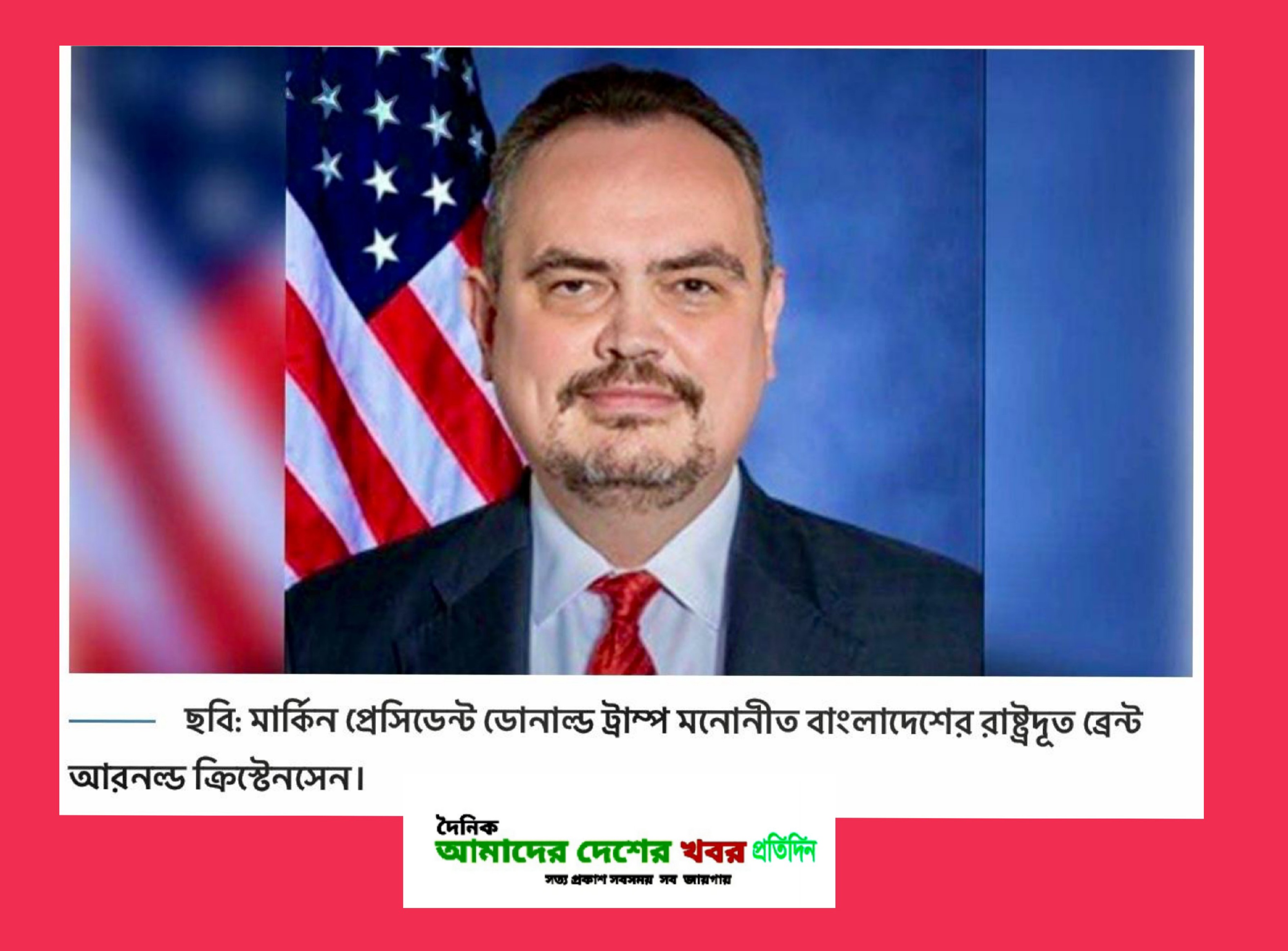বাংলাদেশের যুক্তরাষ্ট্রের রাষ্ট্রদূত ব্রেন্ট ক্রিস্টেনসেনকে ট্রাম্পের মনোনয়ন, সিনেটে অনুমোদনের অপেক্ষায় নিউজ,দৈনিক আমাদের দেশের খবর প্রতিদিন। যুক্তরাষ্ট্রের থেকে বিশেষ প্রতিনিধি: হাকিকুল ইসলাম খোকন। বাপসনিউজঃ ব্রেন্ট আরনল্ড ক্রিস্টেনসেন একজন অভিজ্ঞ যুক্তরাষ্ট্রের কূটনীতিক,