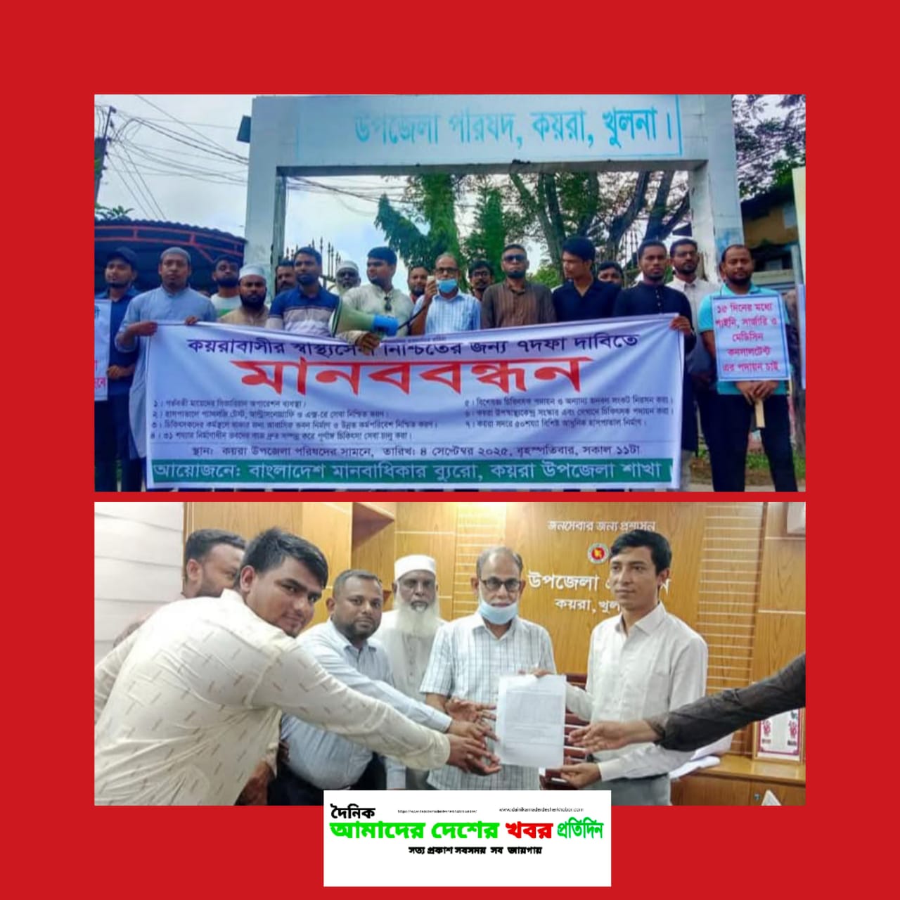 খুলনা জেলা কয়রাবাসীর স্বাস্থ্যসেবা নিশ্চিতের জন্য ৭ দফা দাবিতে মানববন্ধন। নিউজ:দৈনিক আমাদের দেশের খবর প্রতিদিন। বিশেষ প্রতিনিধি:রফিকুল ইসলাম এর বিশেষ তদন্তের অংশ বিশেষ। আজ ৪ টা সেপ্টেম্বর খুলনা জেলার কয়রা